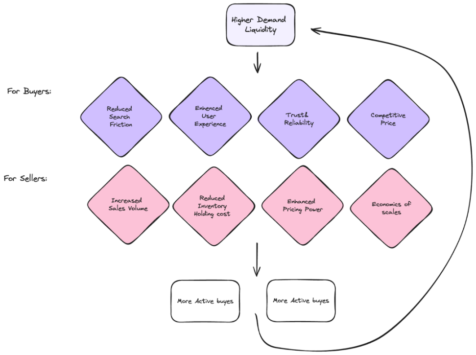 2. 需求的复合增长效应(Compound Nature of Demand): 在一个成功的 Marketplace 平台上,需求的增加应能够引发进一步的需求增长,从而形成一个自我强化的飞轮。当平台上的需求增长时,随之而来的交易活动要能够迅速激发供应的增长响应,这种响应不仅能提高产品的多样性和质量,还能提升用户体验,乃至对平台的信任以达成品牌效应吗,进一步驱动网络效应,使得平台的整体价值持续提升。只有高效地实现这种飞轮效应,Marketplace 平台才能通过持续改进和创新,不断适应和满足用户的需求,从而保持长期的竞争优势。