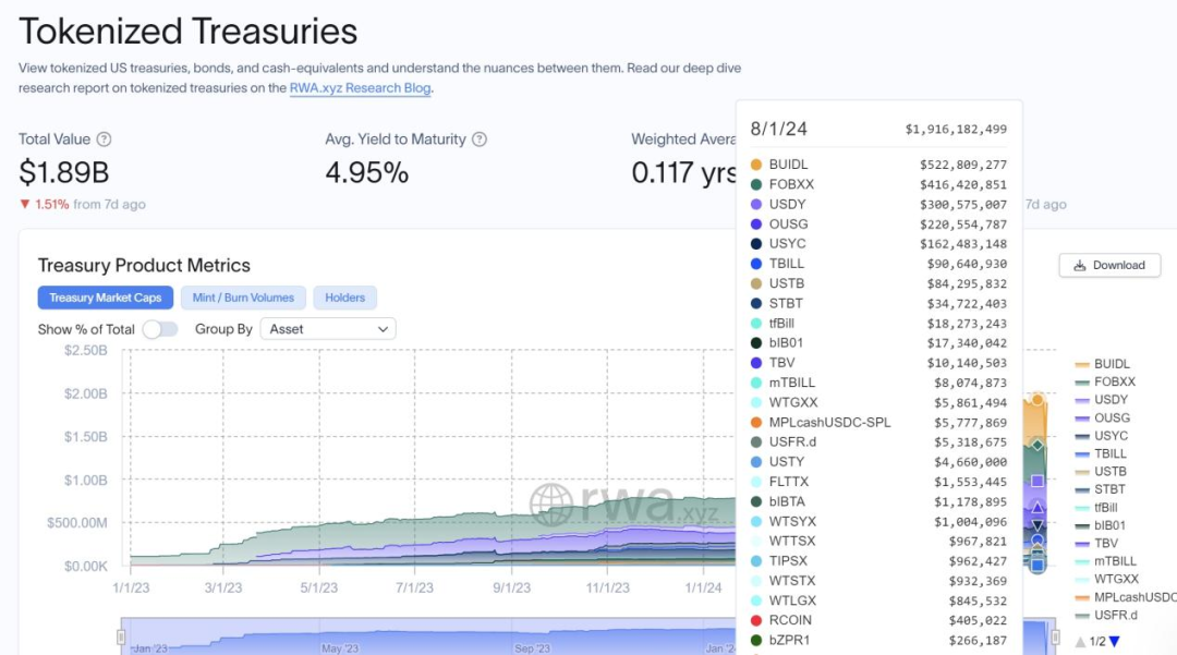 根据 RWA.XYZ 数据,代币化美债市场规模已经从 2024 年初的 7.7 亿美金上升到如今的 19.16 亿美元(截至 2024 年 8 月 1 日),上涨幅度达到 248%。