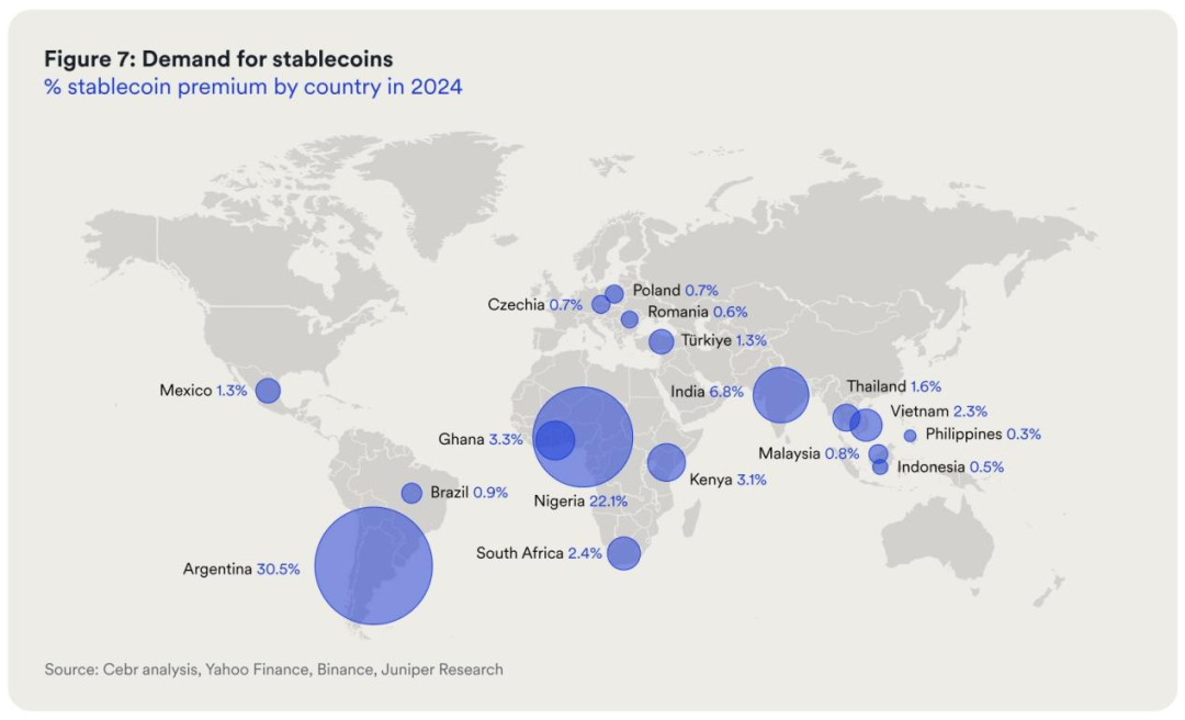 根据 BVNK & Cebr 的研报 The decade of digital dollars,新兴经济体对美元稳定币的需求很大,表现为“稳定币溢价”。在接受调查的 17 个国家/地区的企业和消费者为获得美元稳定币支付了溢价:平均比标准美元价格高出 4.7%,在阿根廷等国家,这一比例上升到 30%。据估计,到 2024 年,这 17 个国家仅为获得稳定币就将支付 47 亿美元的溢价,到 2027 年这一数字将上升到 254 亿美元。