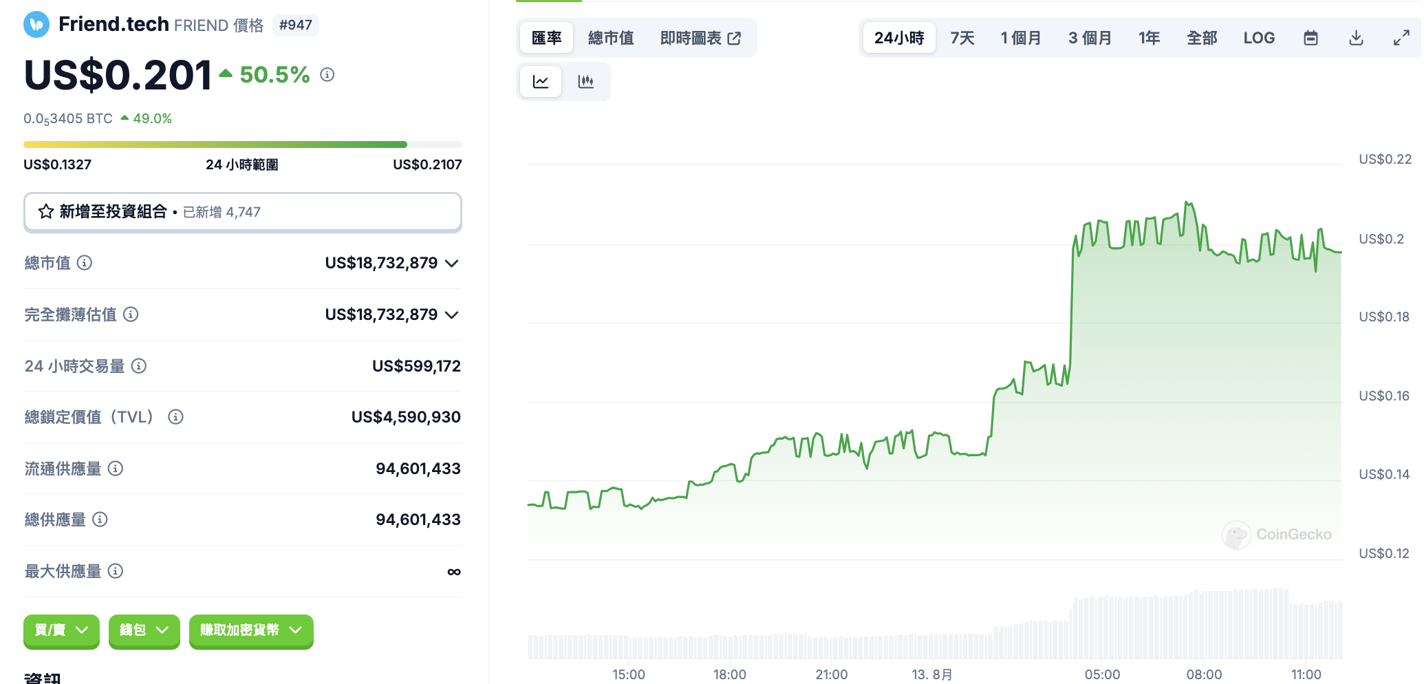 受到麻吉大哥大举𧹒入影响,FRIEND 的价格在一天内最大涨幅达到 72%,截稿前暂报 0.201 美元,过去 24 小时内飙升 50.5%。
