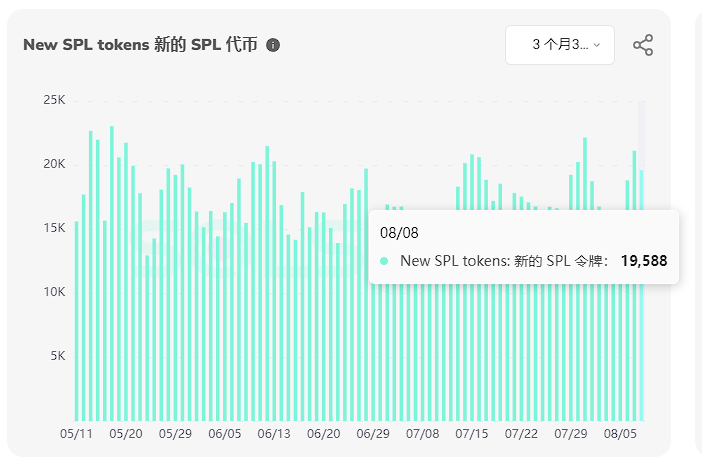 这一资料说明,Pump.fun 上发行代币的数量并未下滑太多,但能够成功上缐 Raydium 的比例越来越低,目前已最高不超过 3%,而在 7 月初这个资料约为 7.3%。