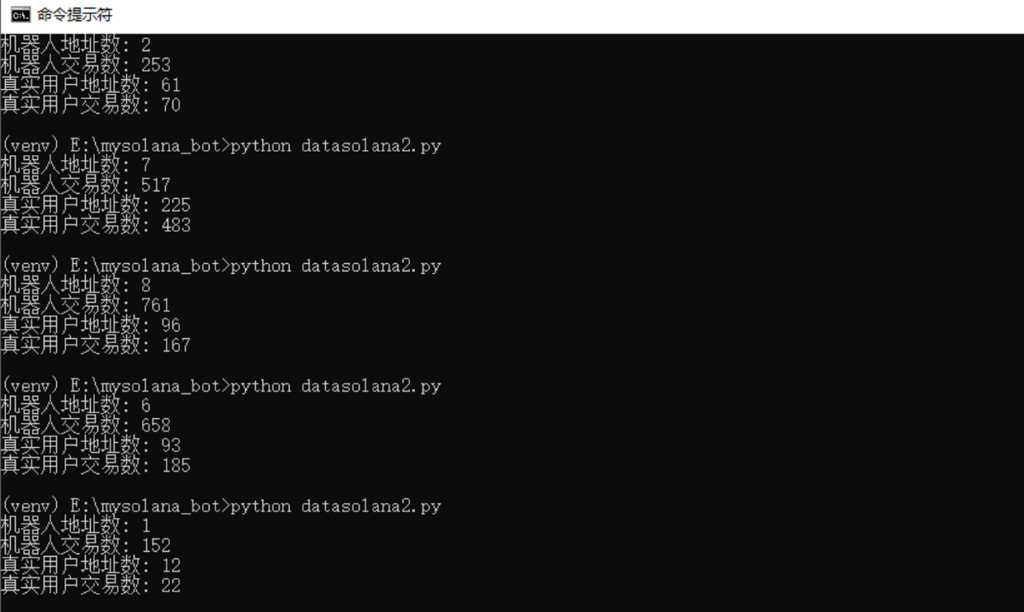 在分析后的结果发现,在这 10 个代币的共计 8268 笔交易当中,有 80.85% 的交易来自机器人交易,真实使用者的交易量不足两成。机器人占比最高的代币占比达到 99.5%,平均每个机器人这个区间内交易了 159 次,而真实使用者的平均值为 1.99。