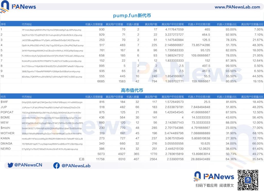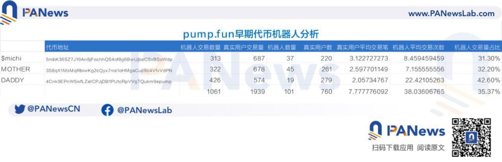 PANews 随后将 Pump.fun 上市值前三的代币在最初建立时的交易资料进行分析发现,2 个月以前,Pump.fun 的机器人比例仅为 35% 左右,并且真实的使用者交易数量和交易笔数都远高于现阶段。