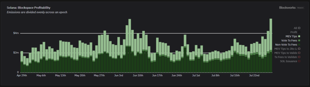 关于 Solana 链上机器人氾滥的问题。近期,已有多个 KOL 在社交媒体表示,Solana 的链上交易充斥著机器人,研究员 Dan Smith 7 月 29 日公布资料显示,Solana 的周交易费和 MEV 收入首次超过了以太坊。