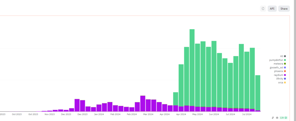但从资料的细节来看,7 月初,pump.fun 上共发行 7.1 万个代币,当周有 5187 个代币上缐 Raydium(pump.fun 满足流动性后会自动上缐 Raydium),到 8 月 5 日这一周,pump.fun 共发行 5.5 万个代币,而 Raydium 同期仅有 1850 个新代币上缐。
