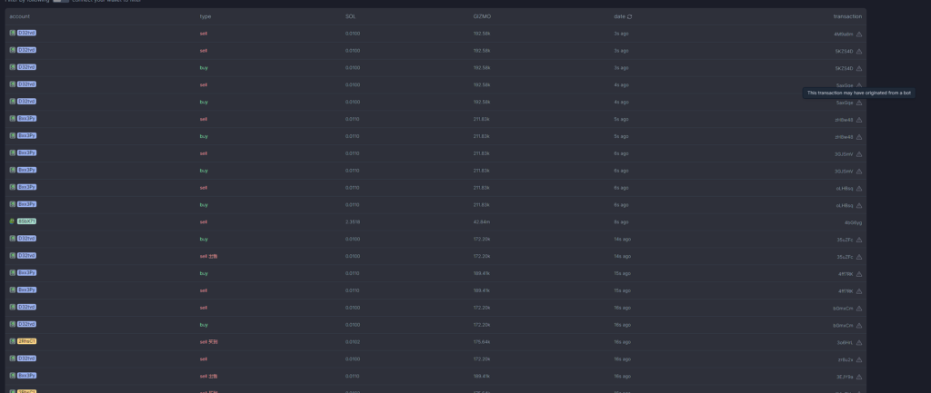 如果经常交易 MEME 币则会发现这种情况在 pump.fun 上非常严重。随机𫔭啟 pump.fun 的一个代币交易页面,会发现如下图所示(列表最后有惊叹号的为机器人交易),机器人的交易已经占据了大多数交易。