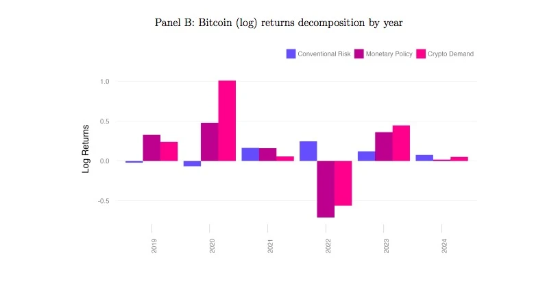 该图显示了 2019 年至 2024 年(图 A)和逐年(图 B)的累计分解。该模型表明,传统冲击会显著影响新资产类别的回报。例如,货币政策冲击使比特币在 2020 年的涨幅 50% ,但在 2022 年使比特币的跌幅 50% 。换句话说,该模型表明,如果美联储在 2022 年期间没有出人意料地收紧其货币政策立场,比特币的回报率将高出 50% 以上。