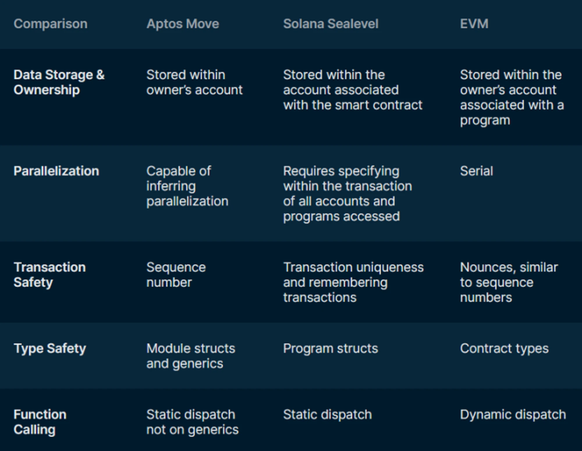 安全性: Move 语言设计的大前提在于安全性,它使用静态类型检查和资源管理来防止常见的安全漏洞,例如溢出错误和重入攻击。对比于其他语言虚拟机,Move 支持多种安全功能,下图引用 Nansen 的对比。