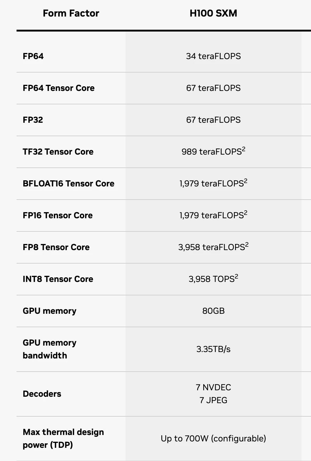 H 100 SXM 芯片 Specification,Source: Nvidia