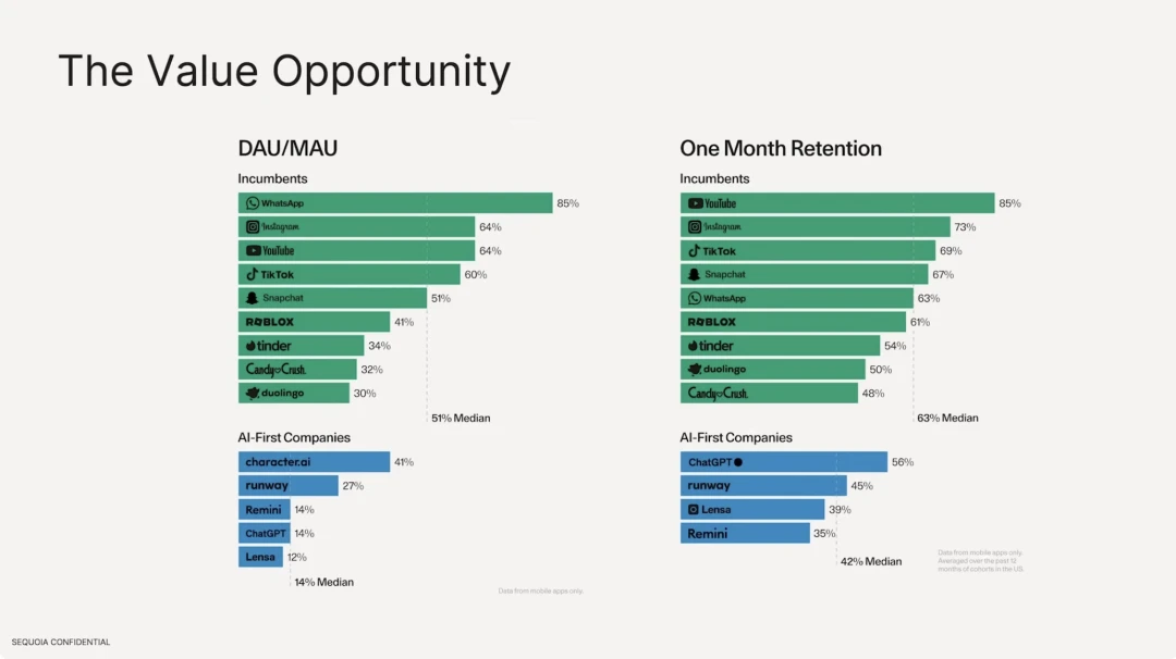 我们同时发现,基于大模型的 AI 应用,其留存率远低于现有的传统互联网应用。活跃用户数方面,传统的互联网软件中位数在 51% ,最高的是 Whatsapp,具备很强的用户粘性。但是在 AI 应用侧,DAU/MAU 最高的为 character.ai 仅仅为 41% ,DAU 占据总用户数量的中位数 14% 。在用户留存率方面,传统互联网软件最好的是 Youtube、Instagram、Tiktok,前十的留存率中位数为 63% ,相比之下 ChatGPT 留存率仅仅为 56% 。