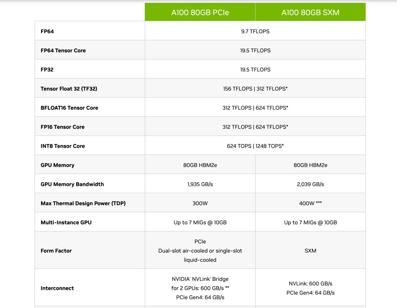 因此读者应该能够看懂这些企业的芯片介绍,如上图所示,Nvidia 的 A 100 80 GB PCIe 和 SXM 型号的对比中,看出 PCIe 和 SXM 在 Tensor Core(专门用于计算 AI 的模块)下,在 FP 16 精度下,分别是 312 TFLOPS 和 624 TFLOPS(Trillion Flops)。