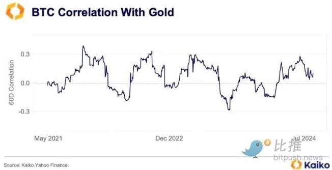 他们表示:「从比特币与黄金之间的 60 天相关性来看,这一点很明显,这种相关性相当弱,过去两年在 -0.3 和 0.3 之间波动。比特币的价格与美国市场密切相关,并且在很大程度上受益于 1 月份现货 ETF 推出后机构采用率的提高。」