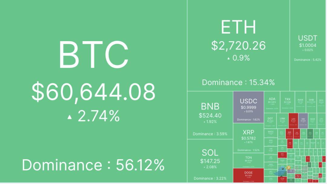 比推数据显示,多头力量将比特币推至 61, 630 美元的日内高位,但遭遇上行阻力。 截至发稿时,比特币交易价格为 60, 644 美元, 24 小时涨幅 2.74% 。