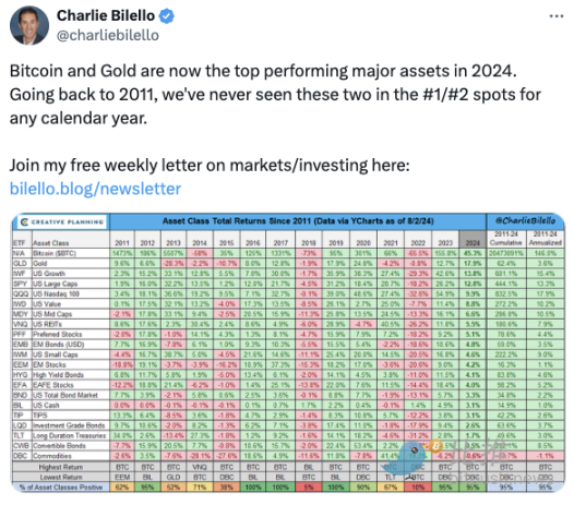 财富管理公司 Creative Planning 首席市场策略师 Charlie Bilello 在推特上表示:「比特币和黄金现在是 2024 年表现最佳的主要资产。 回顾 2011 年,我们从未在任何一年看到这两种资产位居第一或第二。」