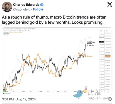 Capriole Investments 创始人 Charles Edwards 表示,基于过去与黄金的相关性,比特币的前景可能很快就会改善,Edwards 提供的 XAU/USD 与 BTC/USD 叠加的图表所示,比特币在黄金上涨之后往往会有大约三个月的潜伏期。
