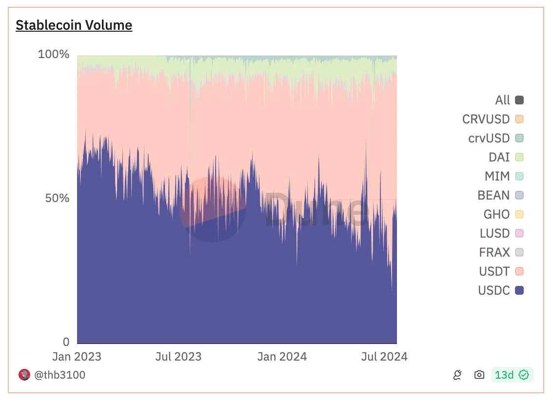 Circle 的 USDC 仍然是全球最大的受监管数字美元,原生支持 16 条不同的区块链,在 DeFi 协议中作为首选稳定币得到了显著使用。其中,最大的交易量发生在 Solana 和以太坊,主要的使用场景包括交易和加密生态系统中的其他活动。为了确保不同支持的区块链之间的兼容性,USDC 开发了一种用于跨链转账的原生互操作性基础设施,称为跨链转账协议 (CCTP)。
