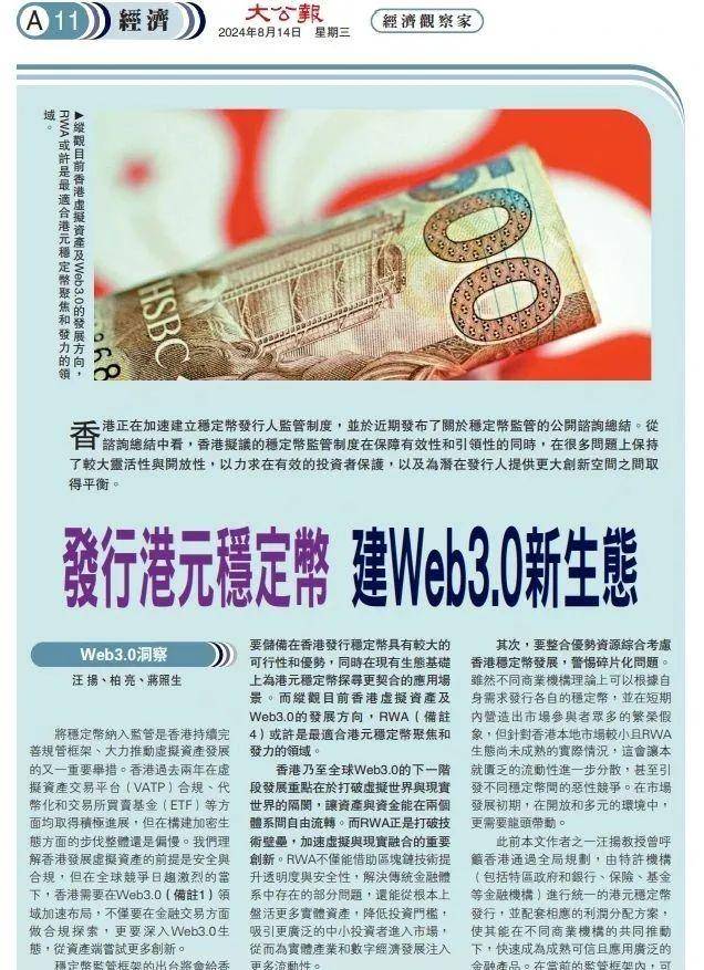 大公报刊文:Web3.0 洞察 / 发行港元稳定币,建 Web3.0 新生态