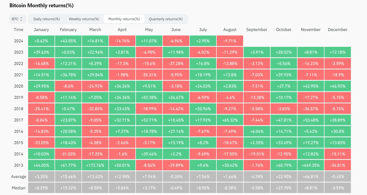 从季节性趋势来看,加密货币价格上涨并不利于其上涨。CoinGlass 编制的数据显示,在比特币历史上, 8 月和 9 月大部分时间的月度回报率为负。