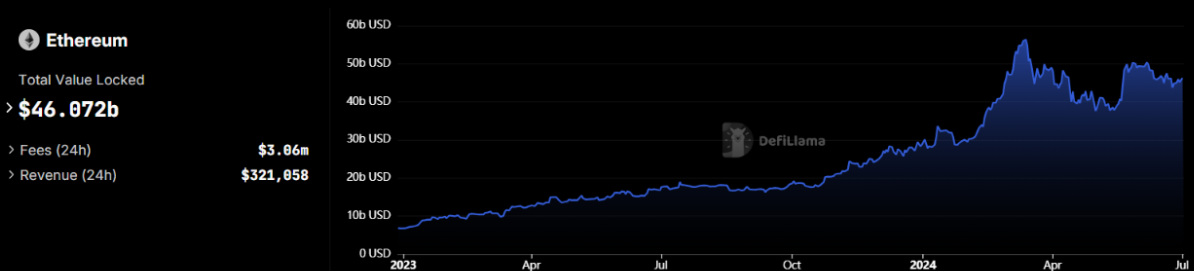 截至 2024 年 7 月 1 日,余额中质押的 ETH 接近 3300 万个,其中约 1340 万个 ETH(460 亿美元)通过流动质押平台质押,占所有质押 ETH 的 40.5%。由于 Eigenlayer 上的原生 ETH 存款增加,而 LST 存款上限有限,这一比例最近有所下降。