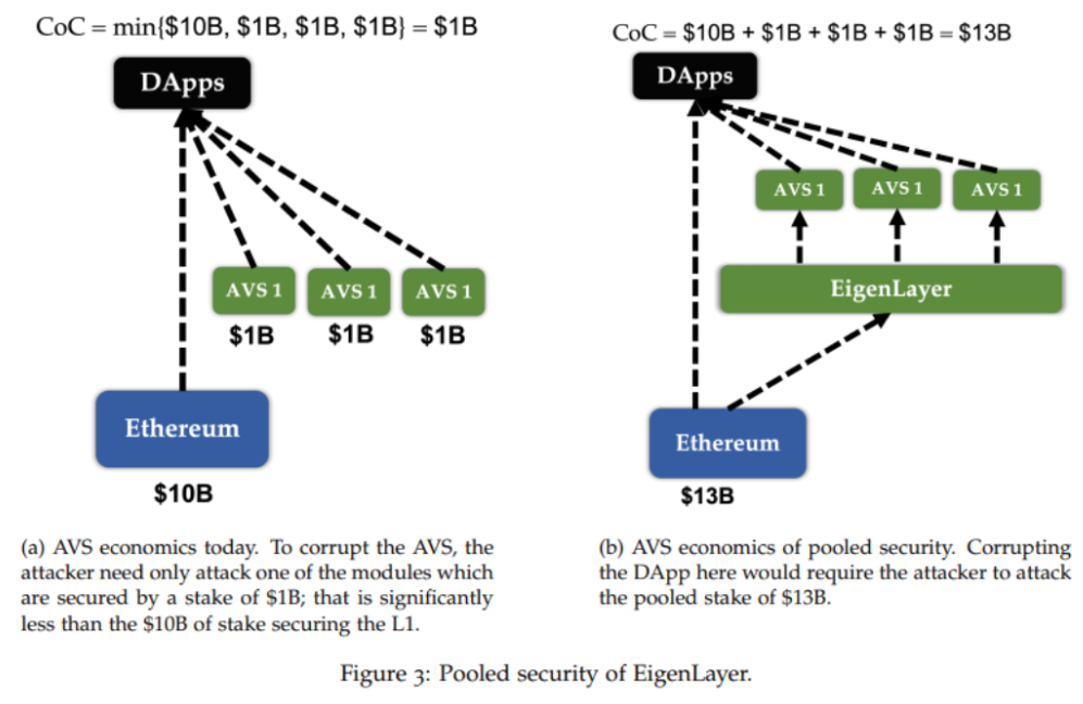 这是由 EigenLayer 首次提出的一个概念,它涉及使用质押的 ETH 来保护无法在 EVM 上部署或验证的模块,例如侧链、预言机网络和数据可用性层。这些模块通常需要主动验证服务 (AVS),这些服务由自己的代币保护,并会遇到诸如需要自己设立其安全网络和信任模型较低等问题。再质押解决了这个问题,因为安全性可以从以太坊的大型验证者集引导,而攻击其池化质押需要更大的成本。