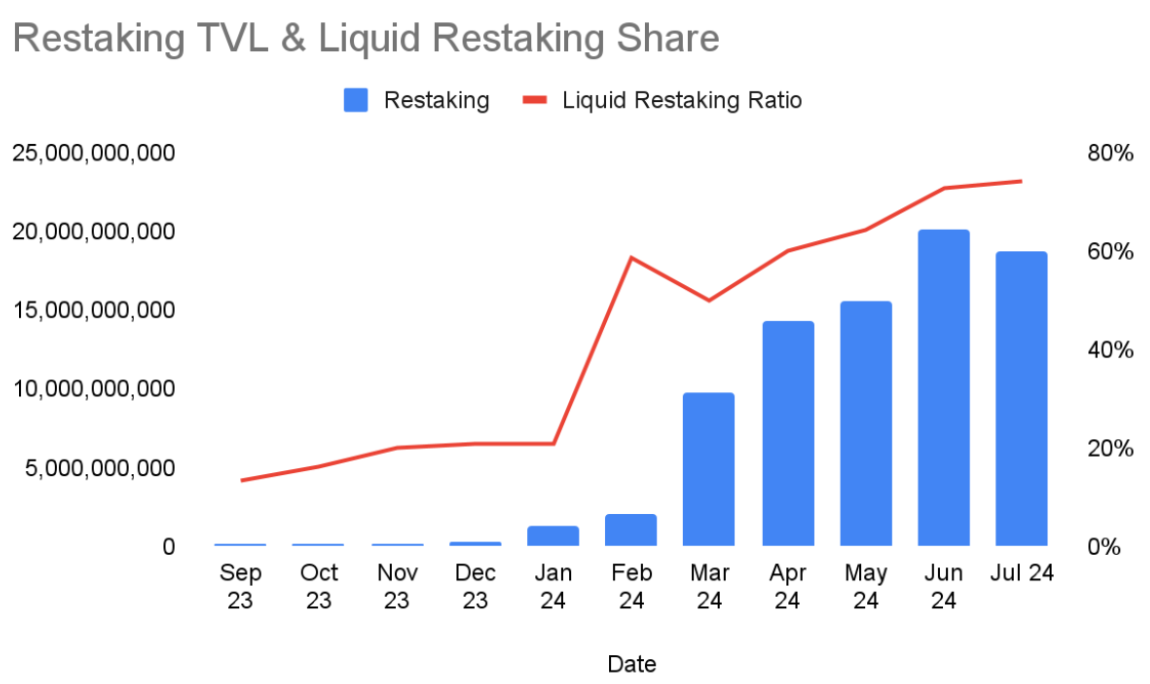 自 2023 年底以来,再质押存款激增。流动性再质押比率(流动性再质押中的 TVL/再质押中的 TVL)已达到 70% 以上,近几个月来持续增长约 5-10%,这表明再质押的大部分流动性都是通过流动性再质押协议进行的。随着再质押类别的扩大,流动性再质押协议预计也会随之扩大。