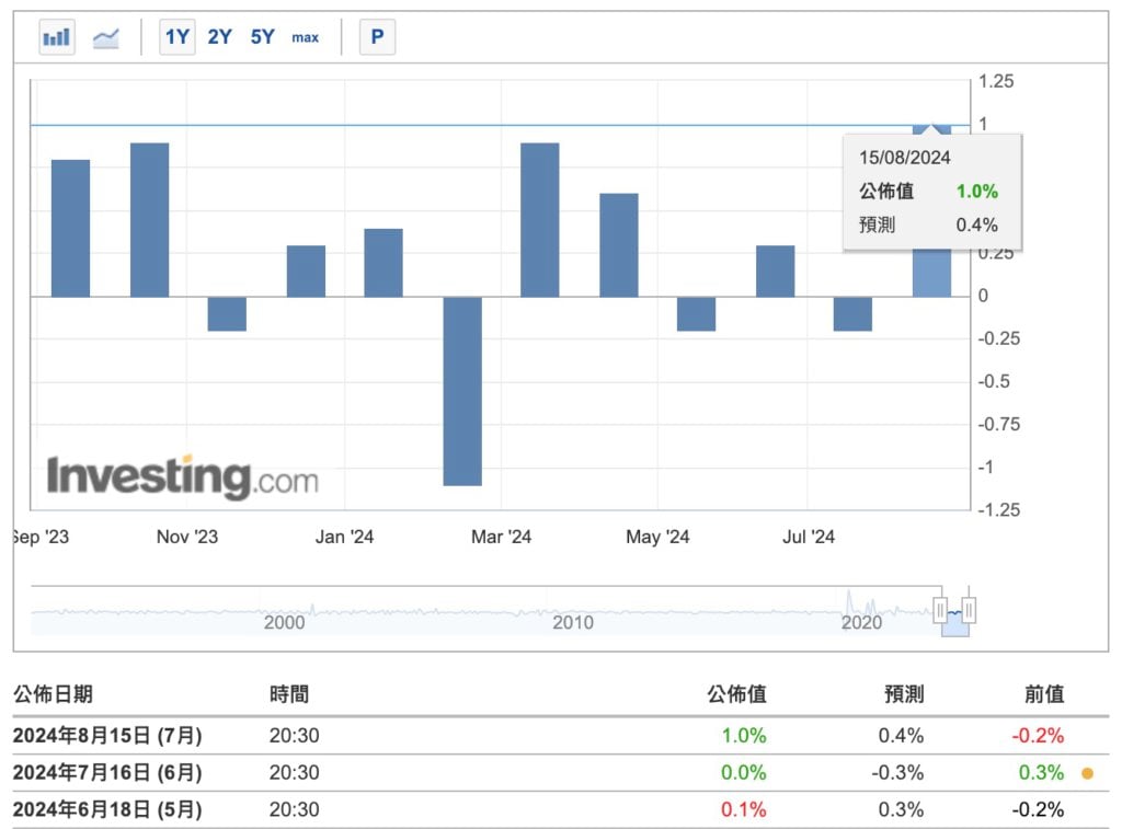 美 国商务部昨(15)晚 20:30 公布 7 月份零售销售报告,结果月增幅 1.0%,创下 2023 年 1 月以来新高、远超市场预期的 0.4%;年增率 2.66%,表明消费者即使在面对高物价和高借贷成本下,仍保持著弹性。