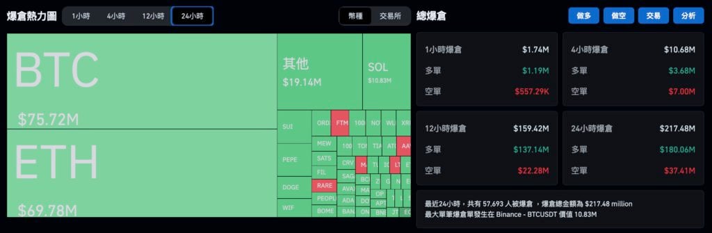 比特币上下波动的行情中,据 Coinglass 数据 显示,过去 24 小时,加密货币全网爆仓金额超过 2.1 亿美元(多头占 1.8 亿美元),有近 5.7 万人遭清算。