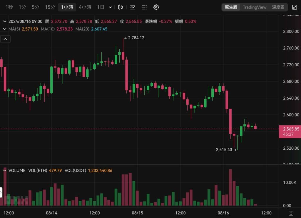 以太坊走势雷同,今晨最低下杀 2,515 美元,撰稿当下报 2,565 美元,近 24 小时下跌 3.84%。