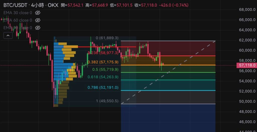不过从费波那契和成交密集区来看,如果比特币目前没有办法守住当前价格水平的话,那下个支撑可能会是 54,500 美元左右。