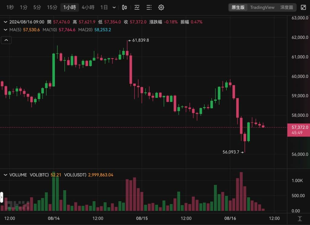 撰稿当下略有回弹报 57,372 美元,近 24 小时下跌 2.45%。