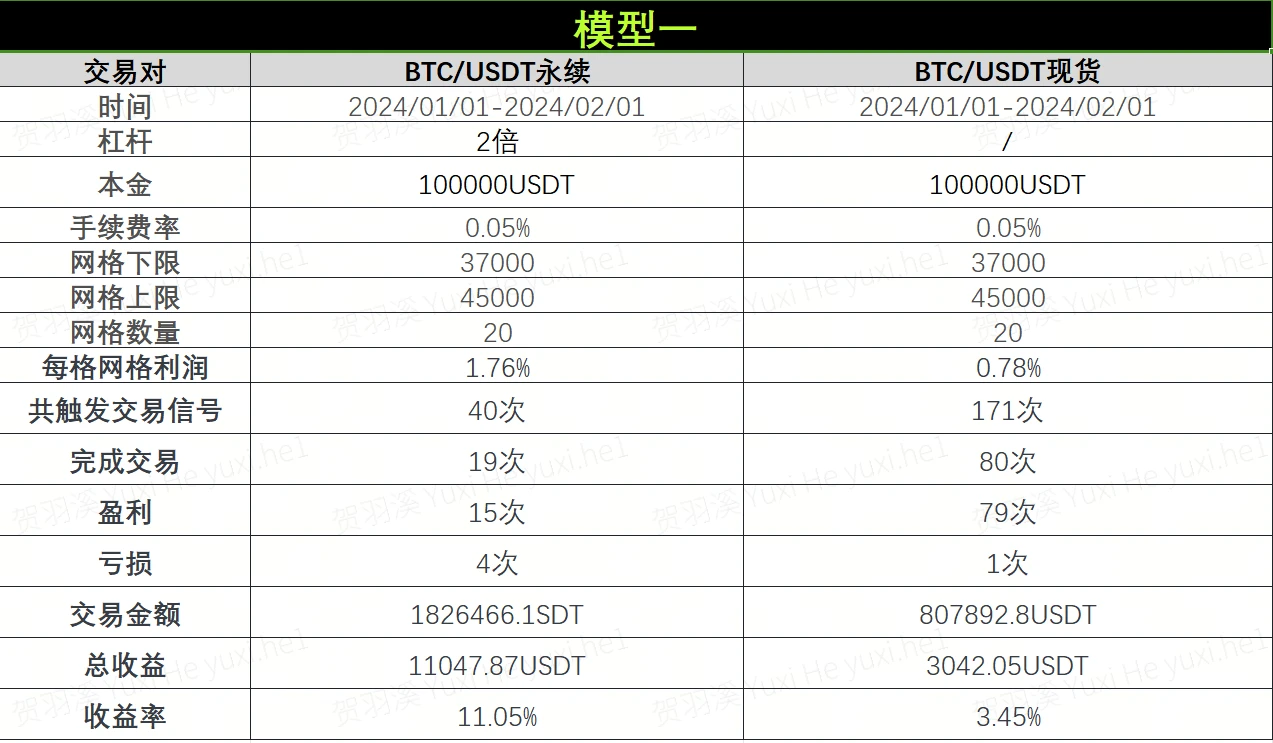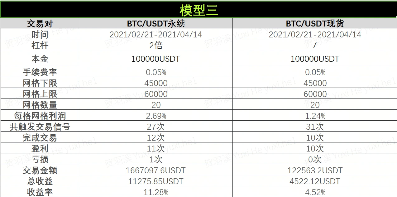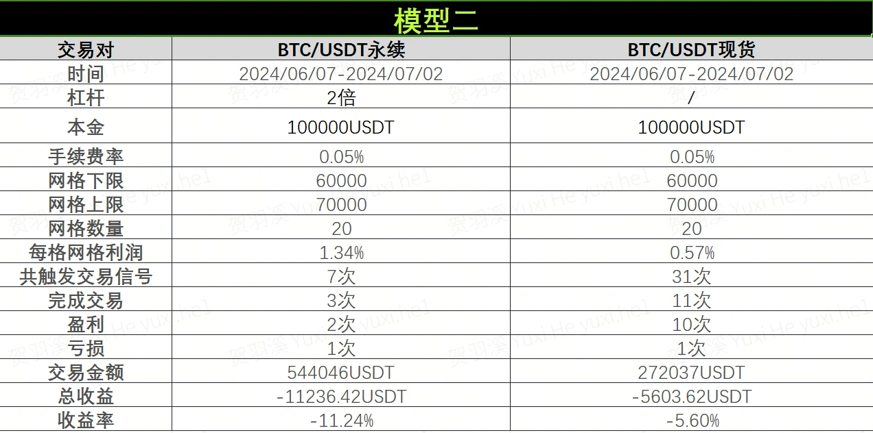 该模型为:横盘震荡 1 h 运行周期下的中性合约网格与现货网格