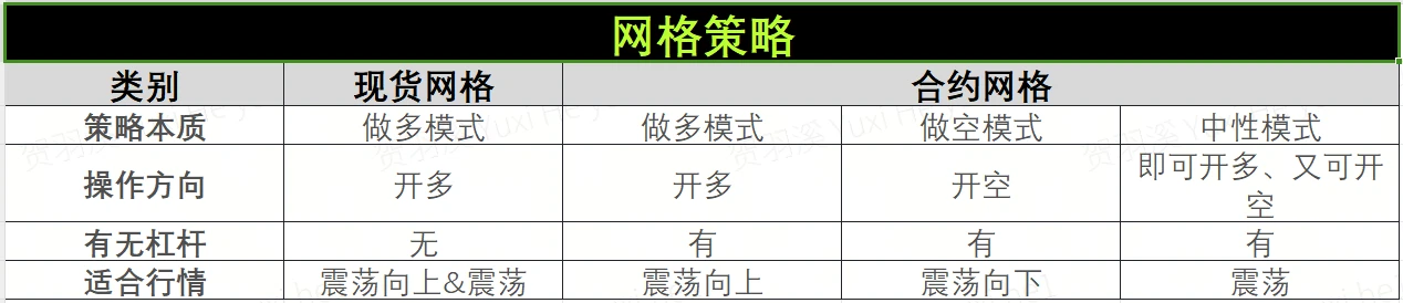 一般而言,网格策略分为:现货网格和合约网格 2 种。其中,合约网格又分为做多模式、做空模式、以及中性模式 3 种,每一种都有各自适合的行情。(注意:合约网格中性模式以下都简称为“中性合约网格”)