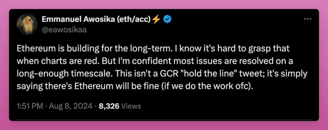 如果你需要更多看涨理由,请查看下面 Emmanuel 的帖子。他之所以看涨,是因为以太坊拥有强大的社区、持续的创新和长期的适应性。