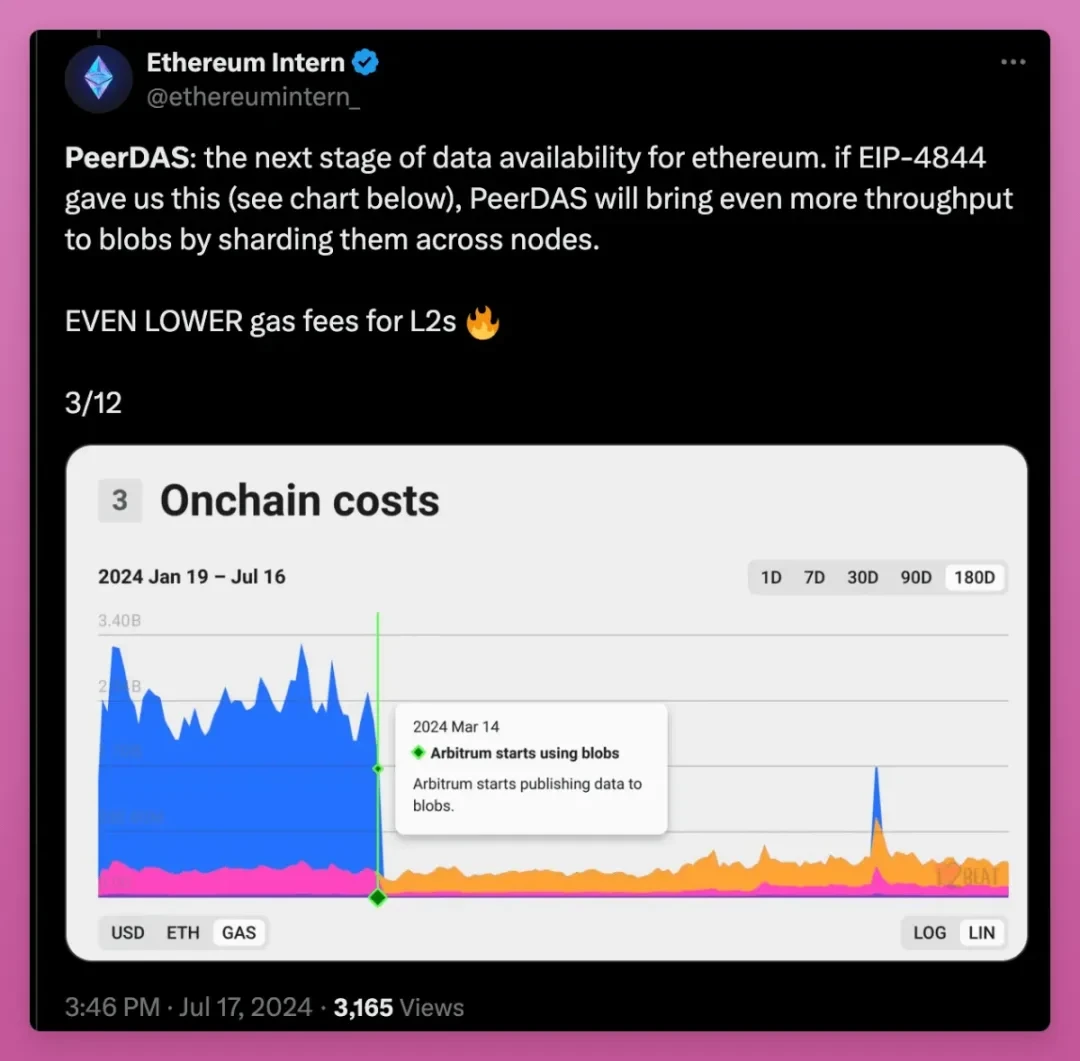 与之前 Dencun 升级中的 Proto-Danksharding 一样,PeerDAS 将进一步降低 L2 交易费用。但我找不到它能便宜多少的具体数字。0x Breadguy 提到 Pectra 将把 blob 容量扩大 2 到 3 倍。