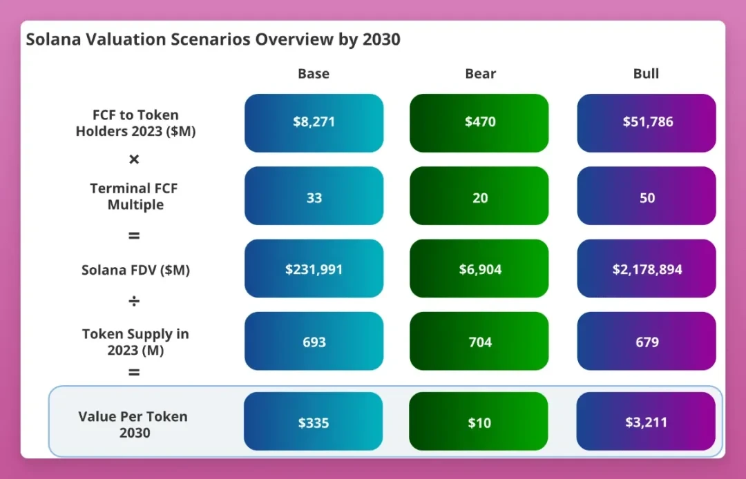 老实说, 1.18 万美元是相当悲观的(我希望它在 5 年后就能达到更高的价格),但请记住,VanEck 对 2030 年 Solana 的基础价格预测是 335 美元。