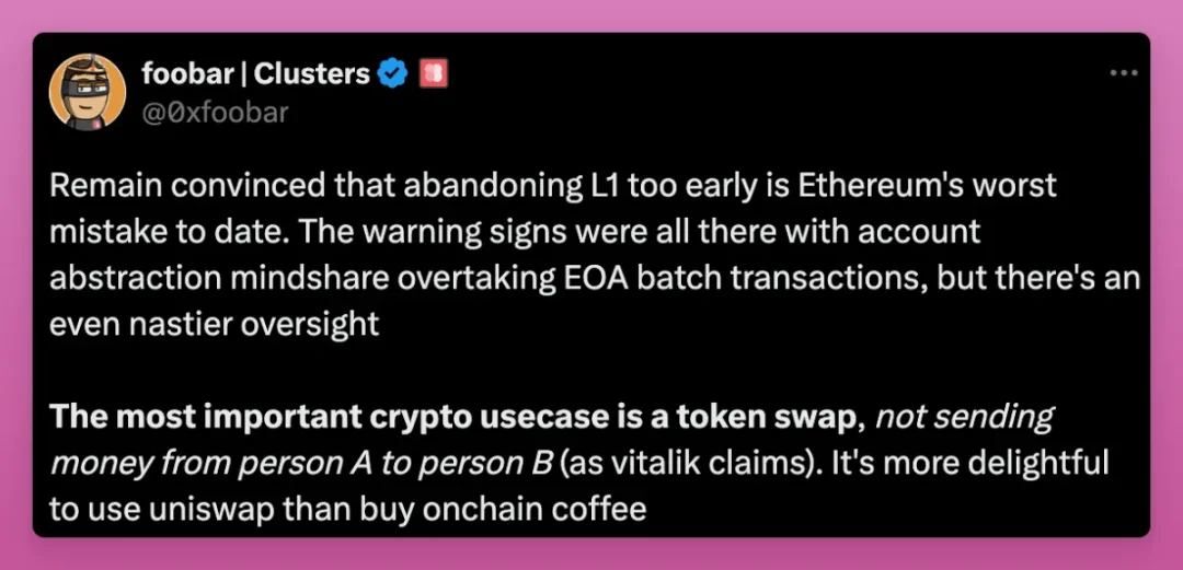 使用 L2 进行模块化扩展提供了长期解决方案,因为始终可以通过针对特定用例启动 L2 来增加扩展性。L2 提供了更大的灵活性、简单性和主权空间。Cygaar 在下面的帖子中很好地阐述了这一点: