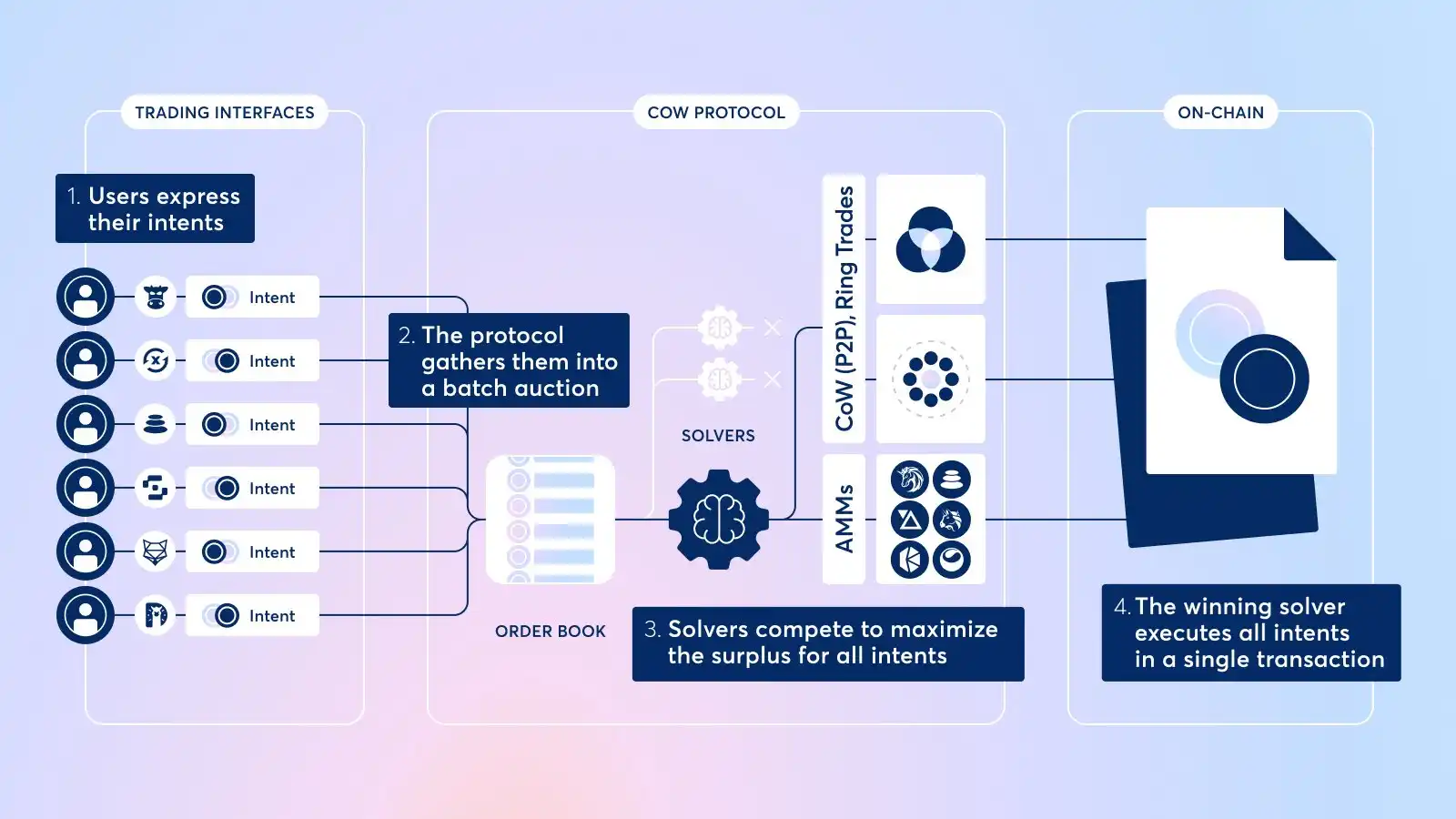 CoW Swap 提供了一种交换服务,通过链下批量拍卖系统保护交易者免受如抢跑、尾随交易或三明治攻击等 MEV(最大可提取价值)攻击。在 CoW Swap 中,交易者不会直接在链上结算交易,而是将交易代币的意图提交给协议。当这些交易者的交易被打包成一个链下批次时,名为 Solver 的第三方实体会从 AMMs(如 Uniswap、Balancer)和 DEX 聚合器(如 1inch)等渠道中找到最佳的交易路径。这使得交易者可以免受 MEV 的影响,并以最佳价格进行交易。