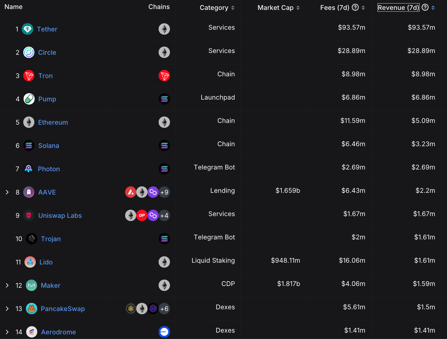 DeFiLlama 数据 则显示,过去一周,Pump.fun 的收入高达 686 万美元,超越了 Aave、Uniswap、Lido 等知名协议,以及 Ethereum、Solana 等主流公链,获利能力非常惊人。