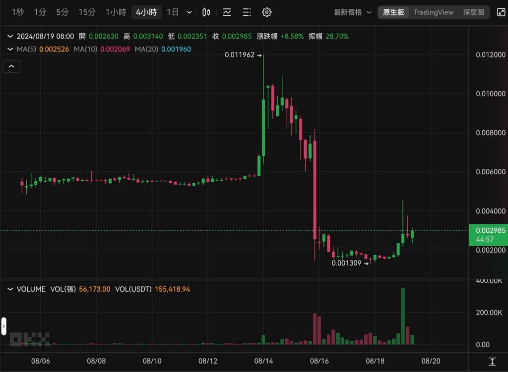 目前 $DOGS 已在 OKX 𫔭放盘前交易,15 日最高一度触及 0.011962 美元后,于刚结束的周末最低触及 0.001309美元,撰稿当下有所回升,最新成交价为 0.00298 美元