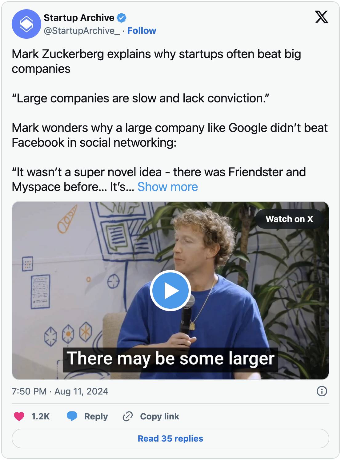 根据扎克伯格的说法,小型初创公司拥有高度信念可以击败任何大公司。