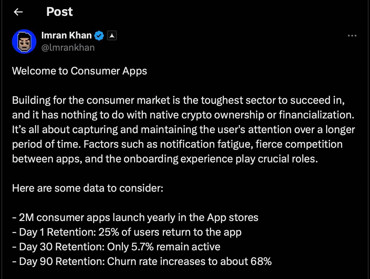 来自 AllianceDAO 的 Imran 表示:我们都对基础设施感到厌倦,打开 CT,看到少数加密基础设施初创公司筹集资金。我们需要更多的消费者应用,更多更多。整个加密社区只知道少数消费者加密应用。