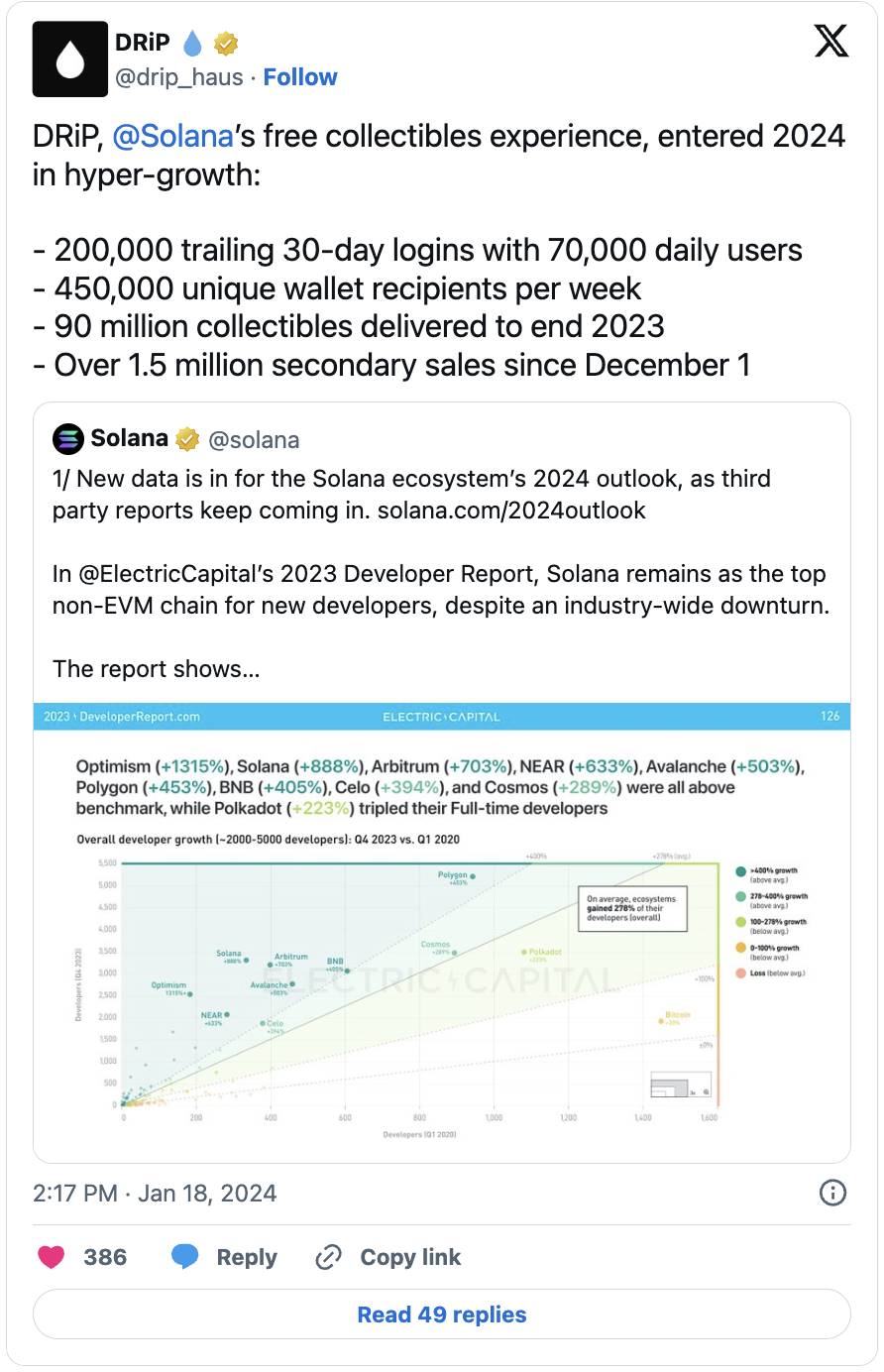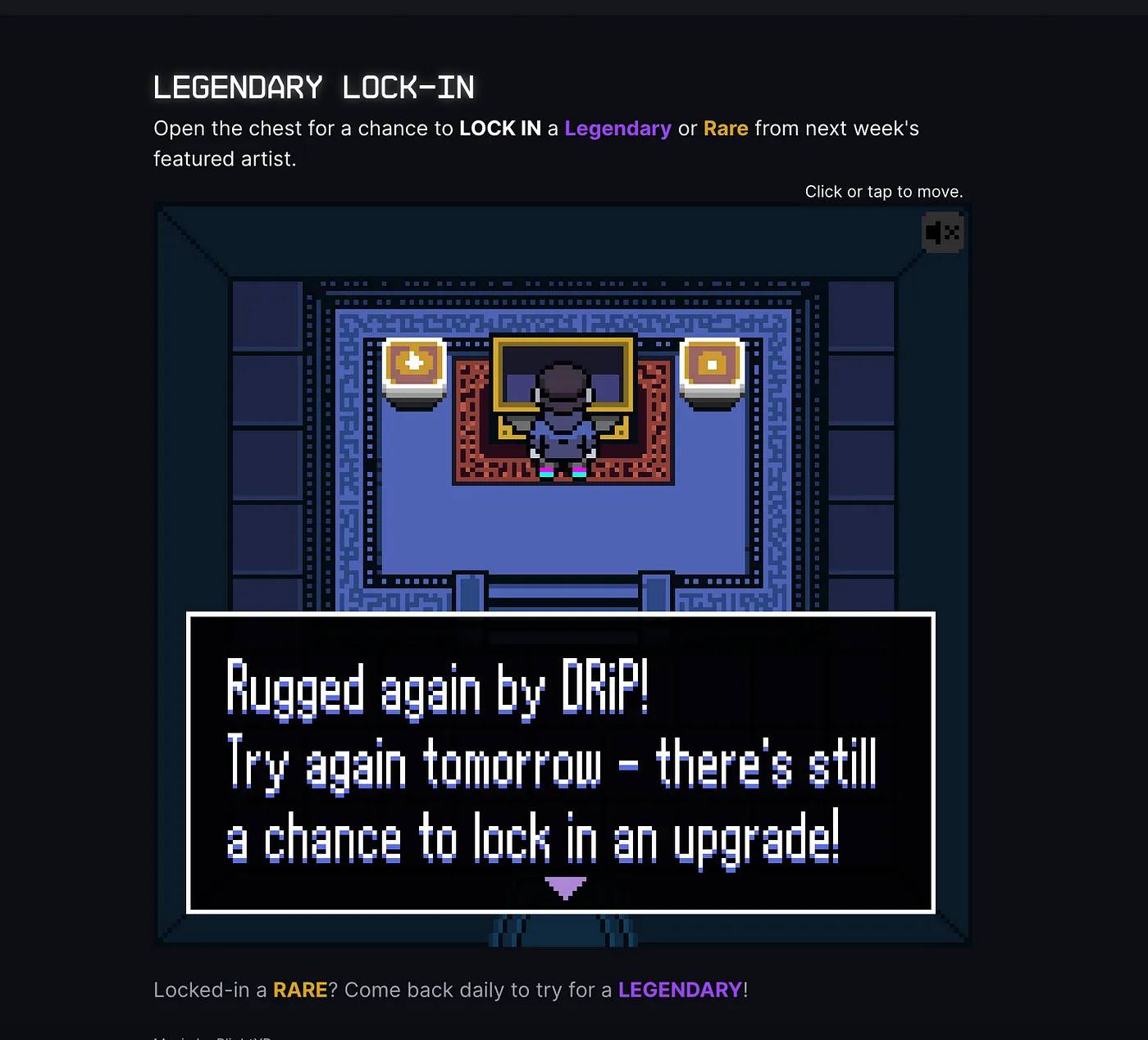 Drip 还有一个机制,用户可以每天解锁一个宝箱,以获得稀有或传奇艺术作品。应用内的小游戏,如宝箱、droplets 机制和稀有度,帮助 Drip 成为所有链上顶级消费应用之一。