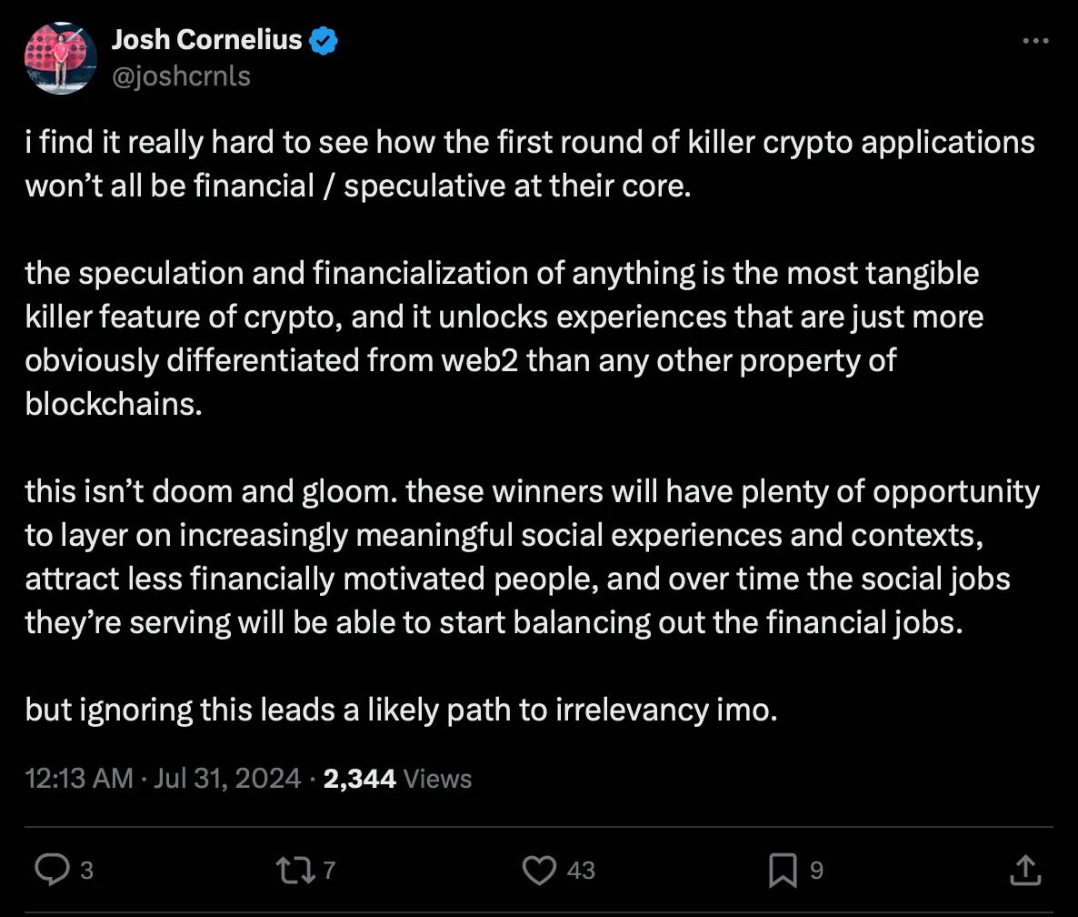 Josh Cornelius: 我觉得很难想象第一轮杀手级加密应用不会全部以金融或投机为核心。对任何事物的投机和金融化是加密的最显著杀手级特性,它解锁了与 Web2 明显不同的体验,这些体验更为独特。这并不是悲观情绪。这些赢家将有很多机会逐步增加更有意义的社交体验和情境,吸引那些财务动机较弱的人,随着时间的推移,他们所服务的社交角色将能够开始平衡财务需求。但个人认为忽视这一点很可能导致无关紧要的结果。