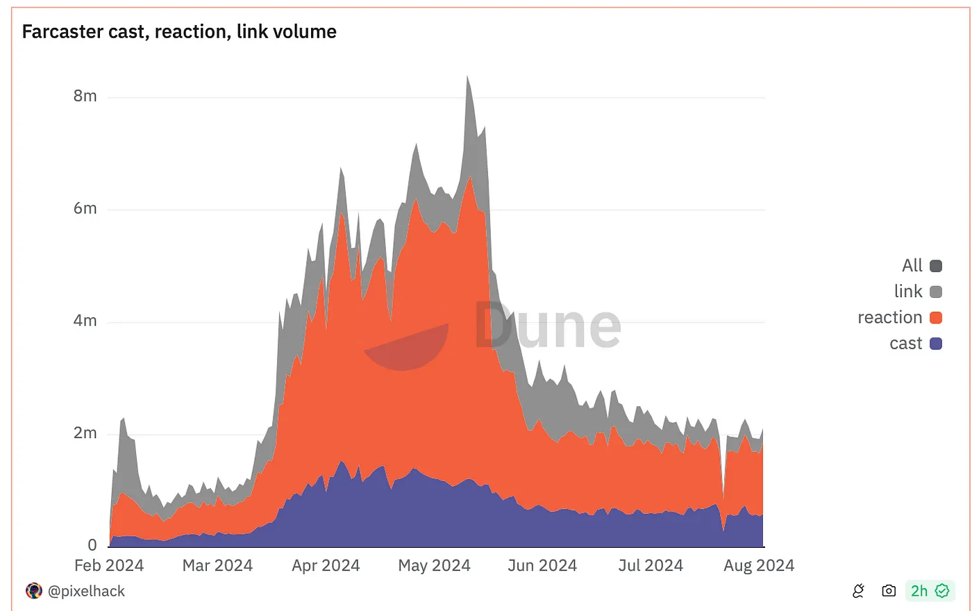Farcaster 在今年 1 月推出框架后,DAU 增长显著,随着用户使用 Farcaster 投放代币,从 degen 开始,随后多个用户使用相同的玩法,Farcaster 的活动达到了历史最高点。我之前非常喜欢 Farcaster,因为其高质量日活跃用户 (qDAUs),但当空投元出现后,这一数字有所下降,但又比之前更好。(听起来有点自私,哈哈,我仍然在使用 Farcaster,只是有点拥挤)