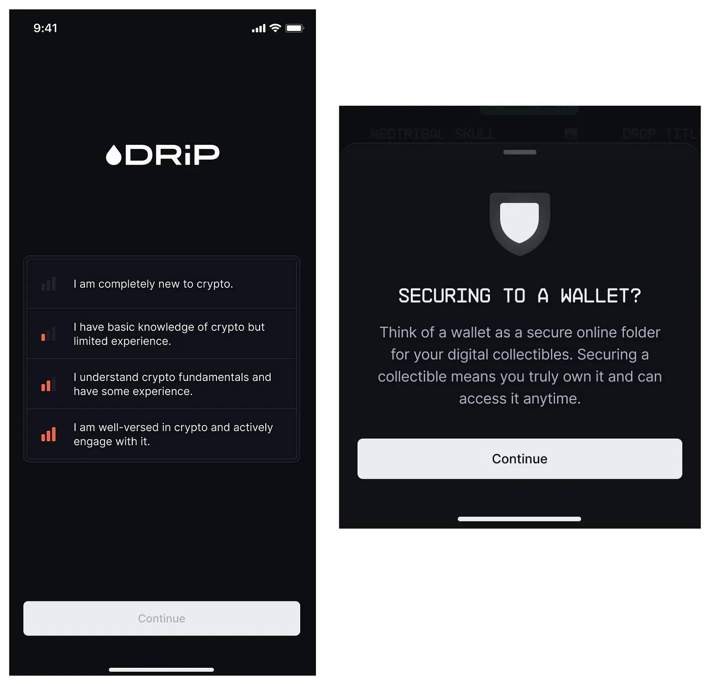 Drip 是一个面向创作者的应用,允许创作者以微不足道的成本将任何艺术作品分发给大规模受众(drip)。用户还可以使用称为 droplets 的东西给创作者小费,你可以将 droplets 看作平台代币,尽管它们不在链上,用户需要购买它们以收集艺术作品、给创作者小费,而创作者也会收到 droplets,他们可以将其兑换为 USDC。