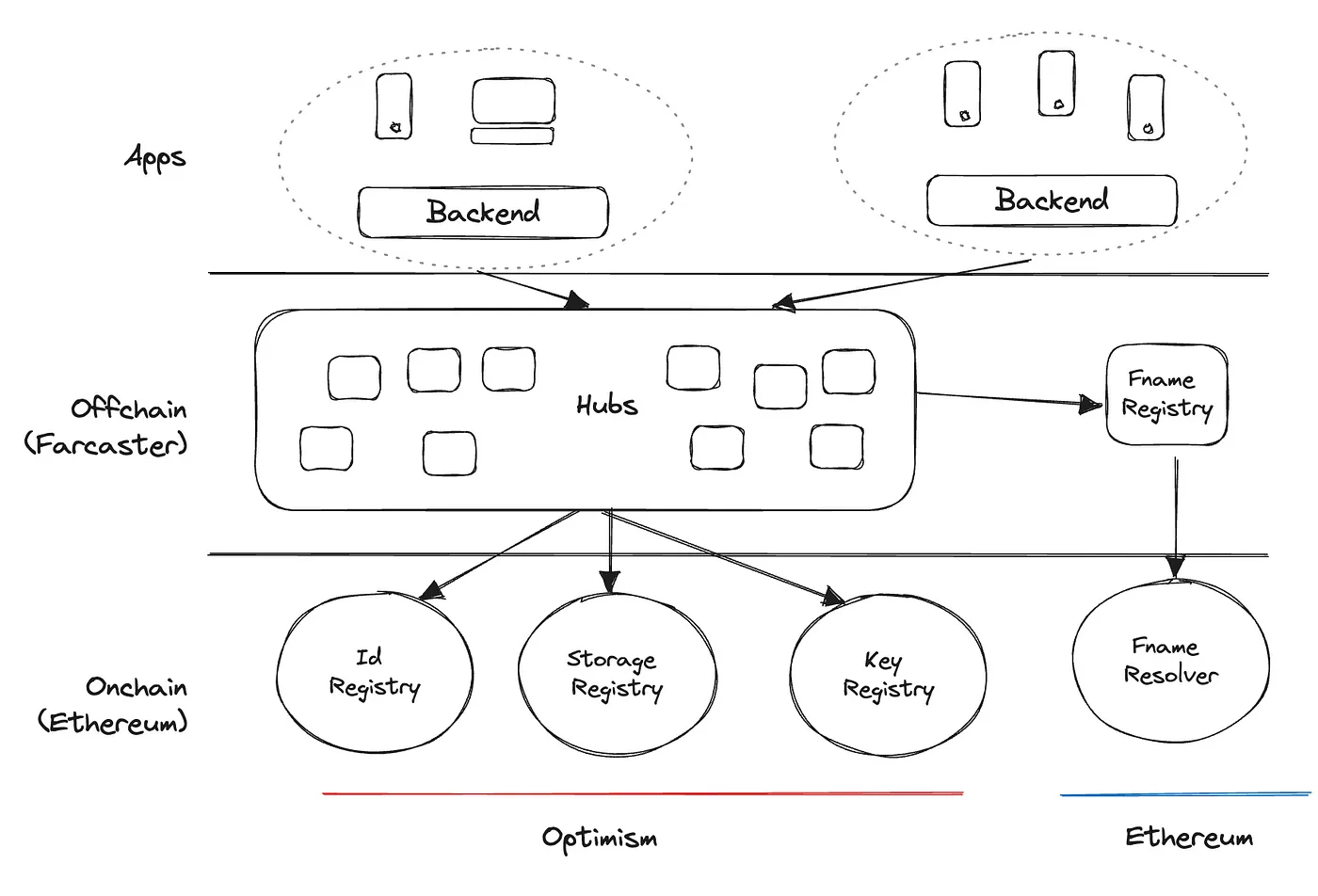 Farcaster 最初在以太坊上启动,后来将主要合约转移到 Optimism,并且它有一个有趣的结构,用户身份和支付存储数据的租金是存储在链上的,而数据则存储在称为 hubs 的链外,这些 hubs 是 Farcaster 数据的节点/验证者。