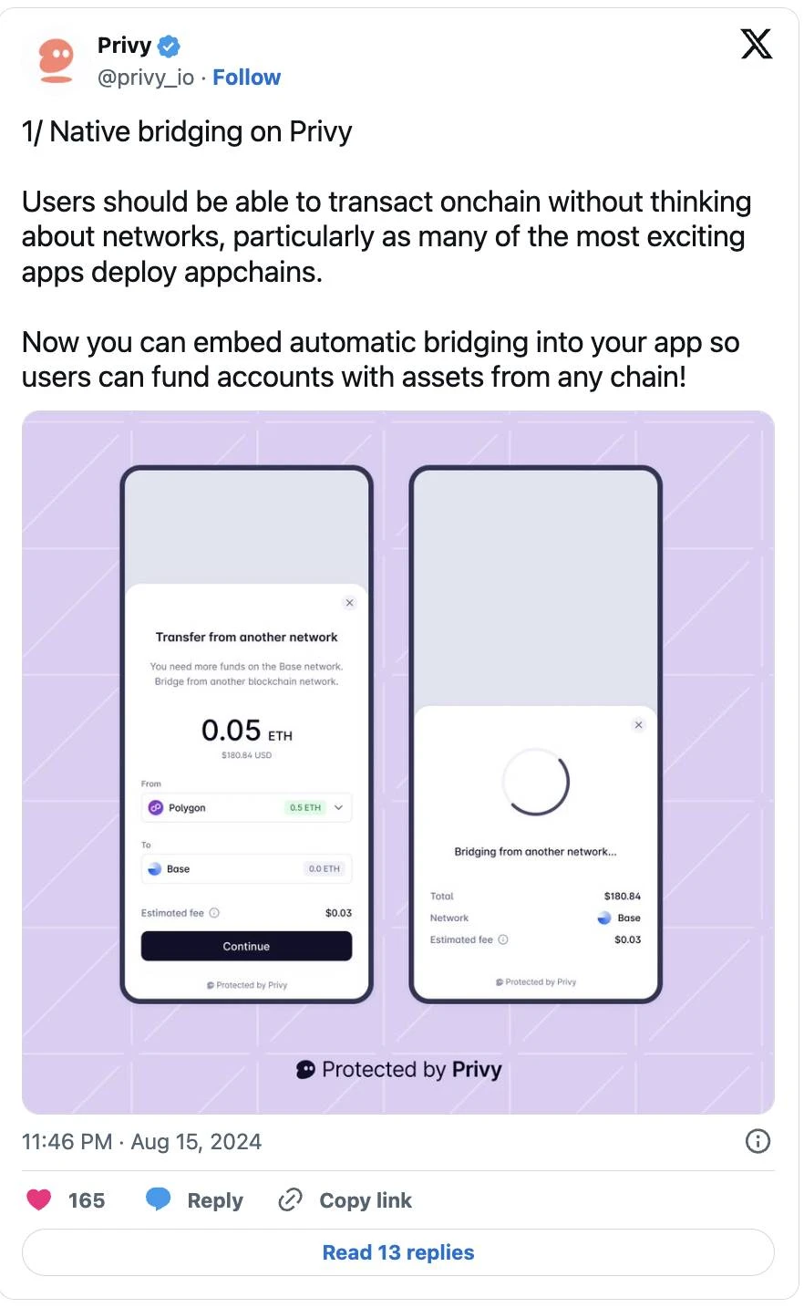 Privy 还通过 MoonPay 和 Coinbase 提供资金转入转出解决方案。最近,他们还推出了一项名为 Native Bridge 的功能 ,使用户能够从任何链上付款,应用将仅在请求链上接收资金。
