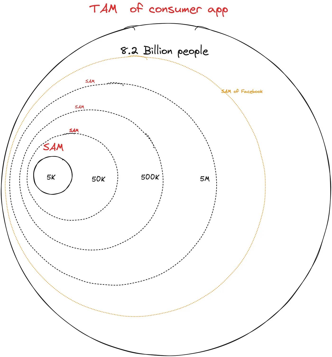 上图描绘了消费者应用的 SAM 如何/应该随着时间而变化。因此,总体而言,如果你首先覆盖了加密领域的 SAM,那么你只应向加密外的人推销。