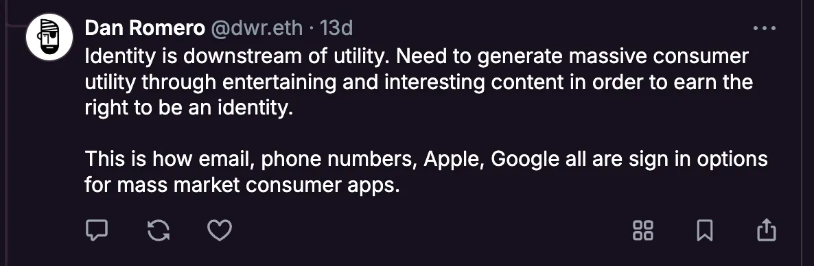 Dan Romero: 身份依赖于效用。需要通过娱乐性和有趣的内容来产生巨大的消费者价值,以获得身份的权利。这就是电子邮件、电话号码,以及 Apple 和 Google 等服务作为大众市场消费应用的登录选项的原因。
