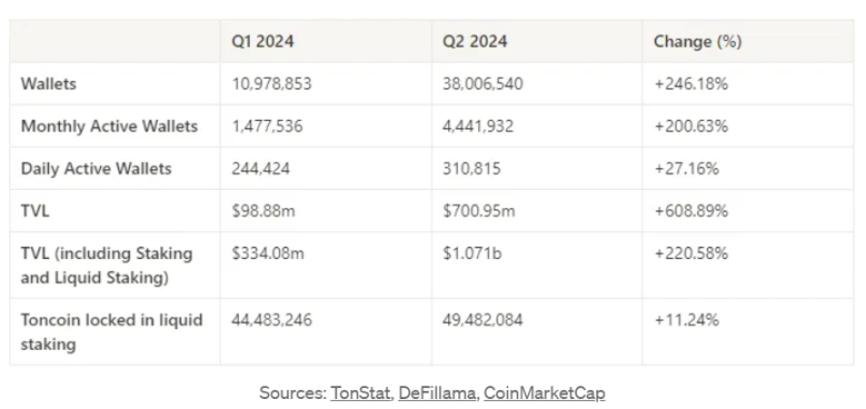 2024 年第二季度,TON 的特点是各项数据指标呈现爆炸式增长。TON 推出原生 USDT 之后极大推动了其上主要 DeFi 协议的流动性和交易量。激励计划也在获得新用户以及增强生态 TVL 方面发挥了重要作用,钱包数量和月活钱包数量在本季度增长 200% 以上。